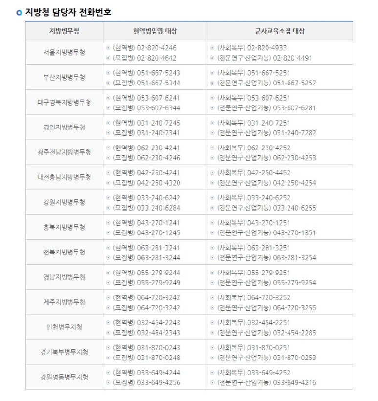 지방병무청 병무지청 전화번호 현역병 모집병 사회복무 전문연구 산업기능 담당자 서울 부산 대구 경북 경인 광주 전남 대전 충남 강원 충북 전북 경남 제주 인천 경기북부 강원영동 네이버 블로그