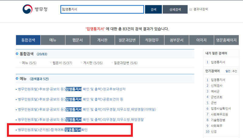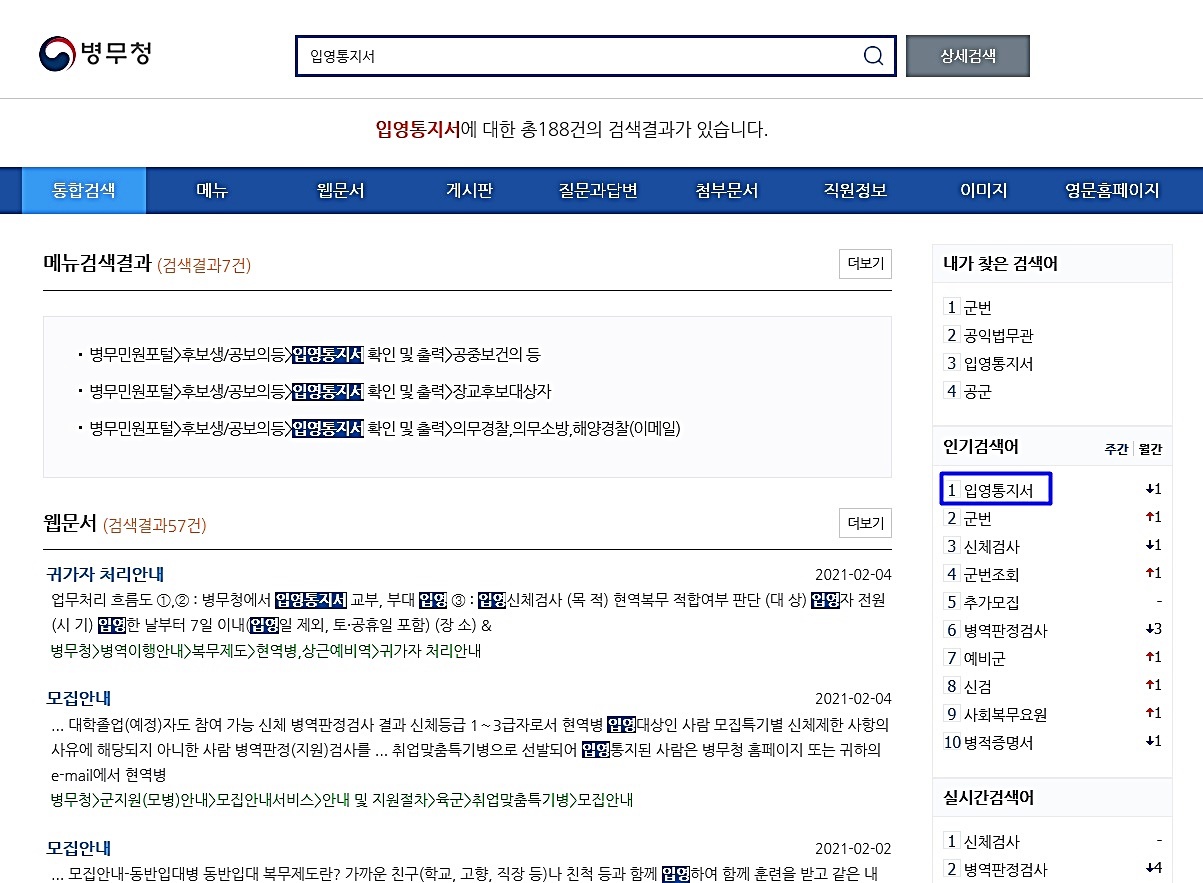 간단하게 아래링크 클릭하셔도 들어가실 수 있도록 해놓았습니다. 입영 내지는 소집을 위해서 병무청에서는 입영통지서 또는 징집통지서를 보내게 됩니다. 병무청 병무청 누리집 사회복무요원 신체검사 실시간검색어 인기검색어 입영통지서 카투사 여러분 병무청 누리집에서는 군 지원을 위한 수많은 병무용어를 검색하면 자세히 알려주는 검색기능이 있다는 사실 알고 있었나요.